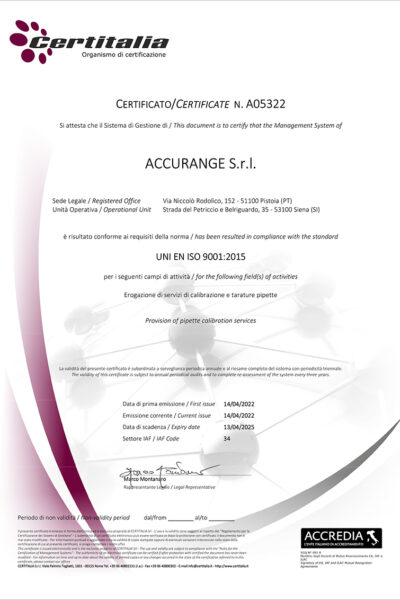 Accurange è un’impresa italiana nata nel 2013 che si occupa di manutenzione degli strumenti, lavorando come fornitore esterno per l’industria farmaceutica. L’esperienza di Accurange è focalizzata principalmente sulla calibrazione e taratura delle pipette.